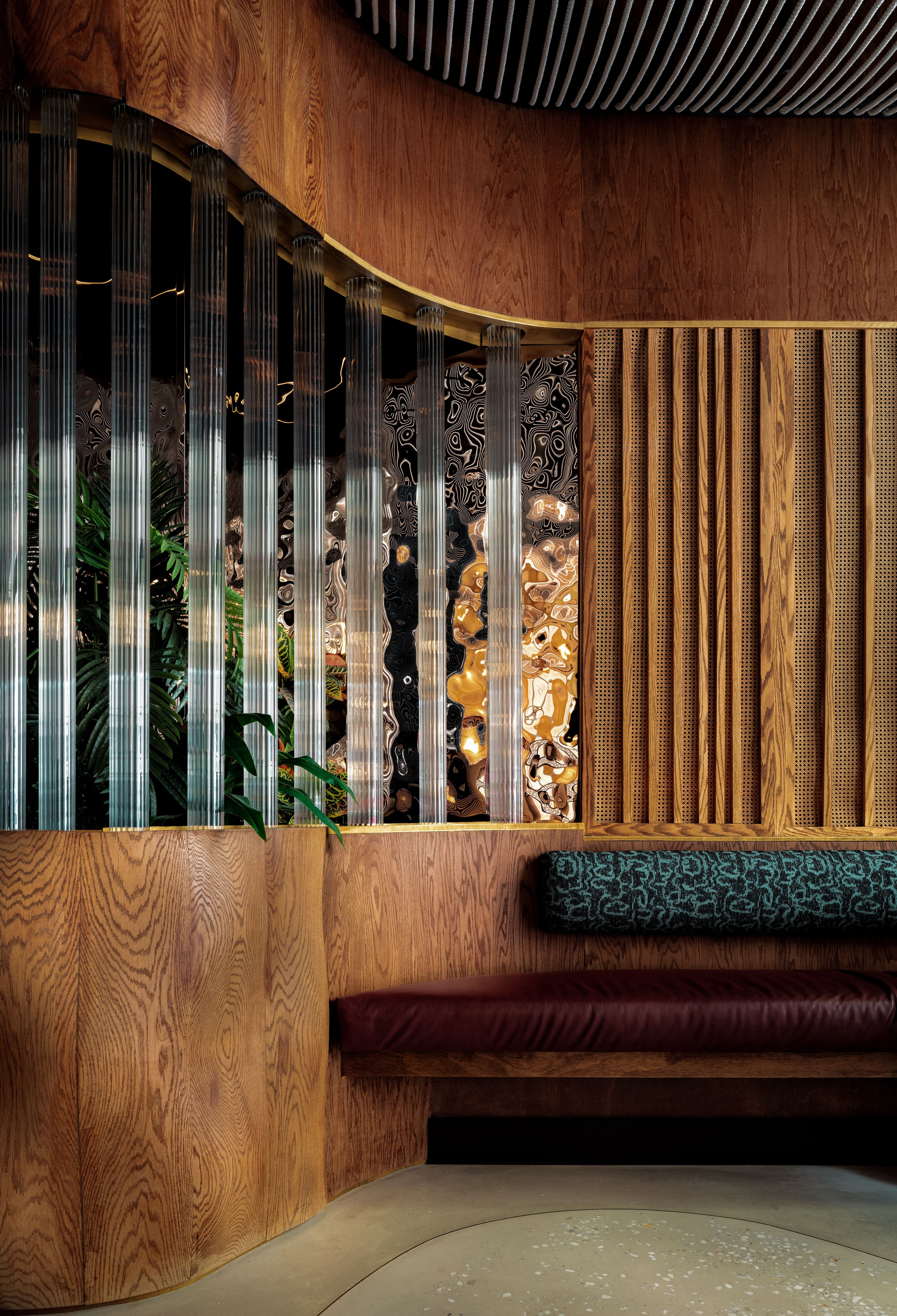 Custom-built elements that define the restaurant’s identity include CNC-milled woodwork, woven rope ceilings, patterned terrazzo flooring, brass inlays, and bespoke lighting fixtures. Because design, prototyping, and fabrication all happened under one roof, the transition from concept to construction was both efficient and precise, eliminating the gaps that often occur between designers and contractors.